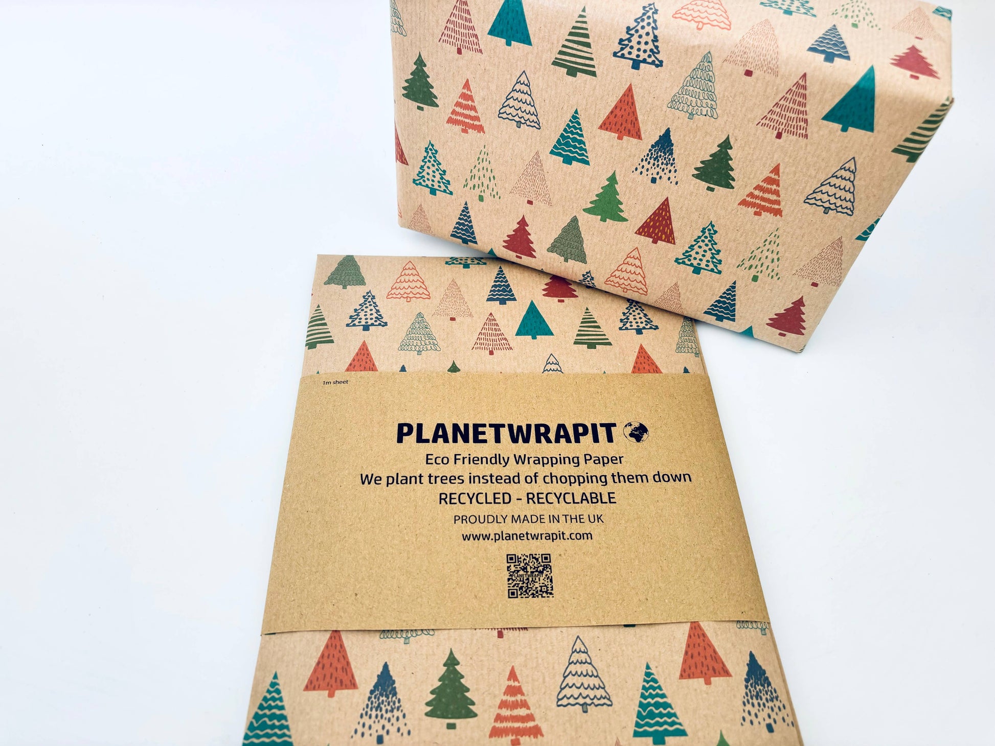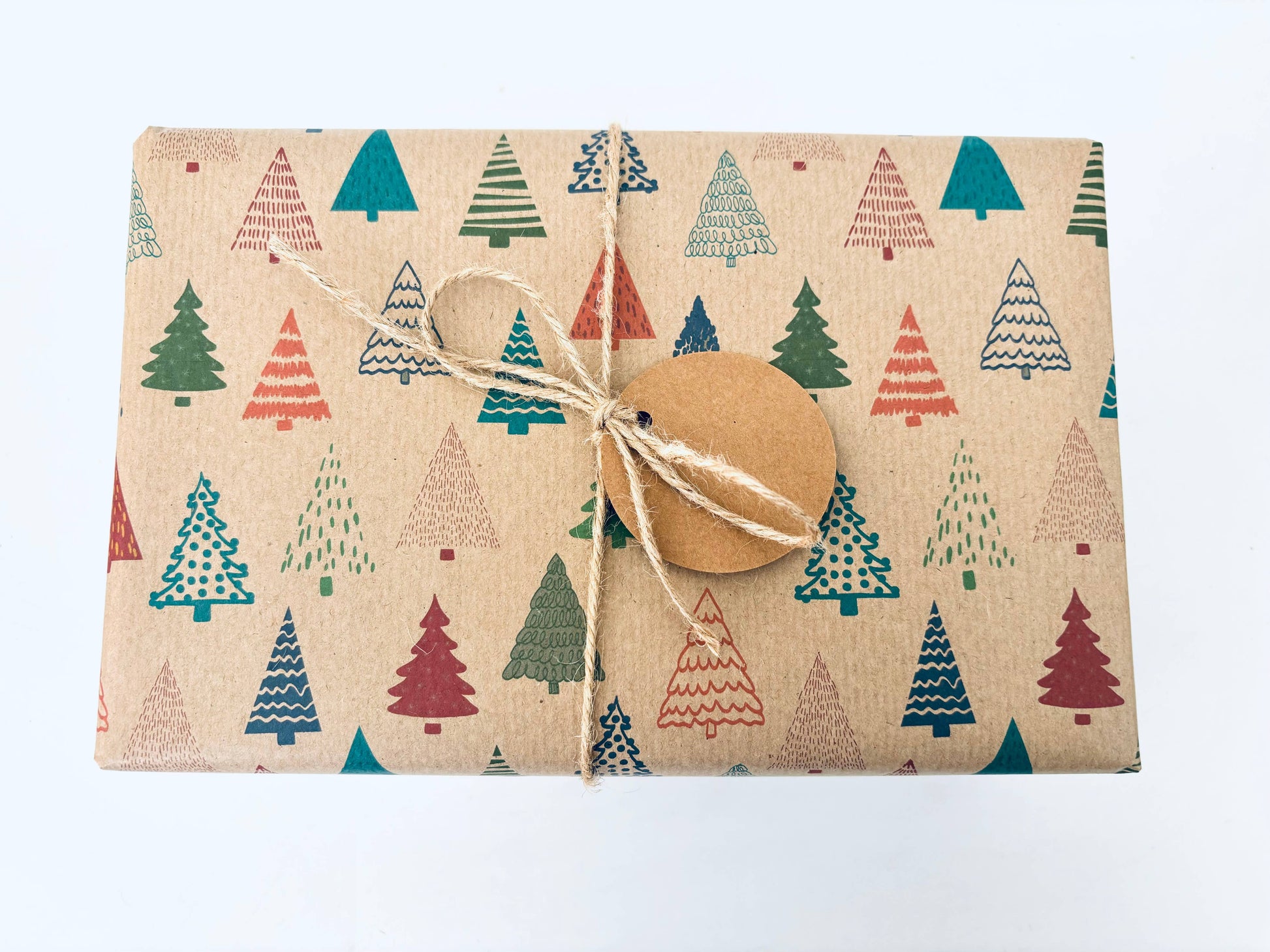 Colourful Christmas Trees Recycled Kraft Gift Wrapping Paper: 1m x 50cm A4 Folded Sheet