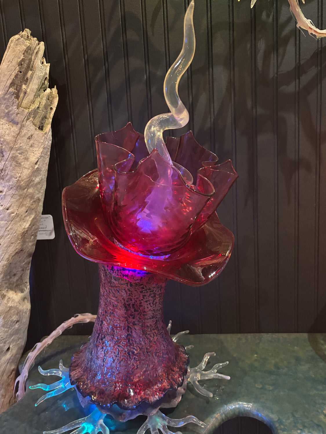 Elevate your collection with this captivating glass and poly botanical sculpture by Erick Dunn. Perfectly designed to mesmerize, it serves as a breathtaking centerpiece by day and transforms your space into an enchanting ambiance at night.