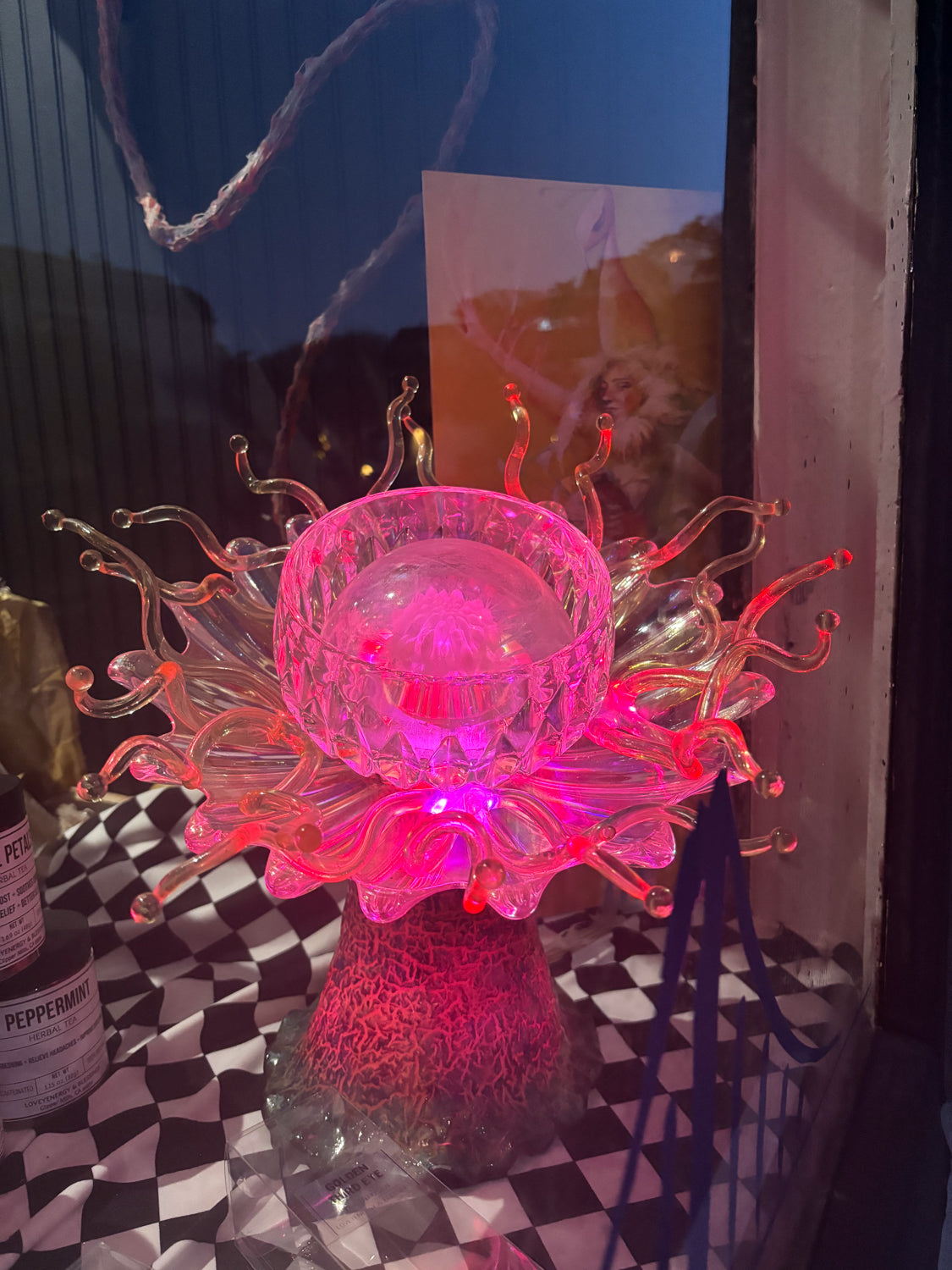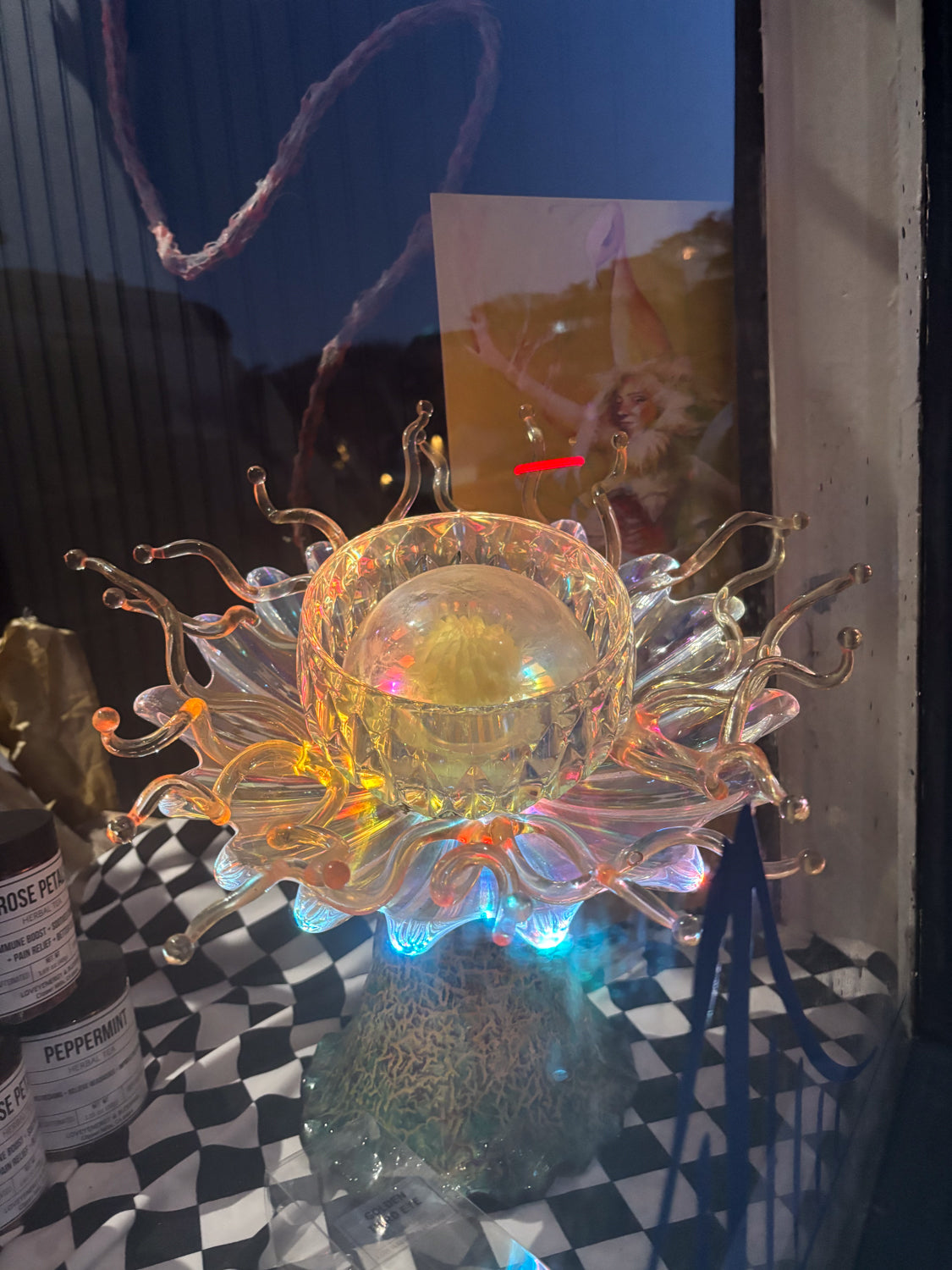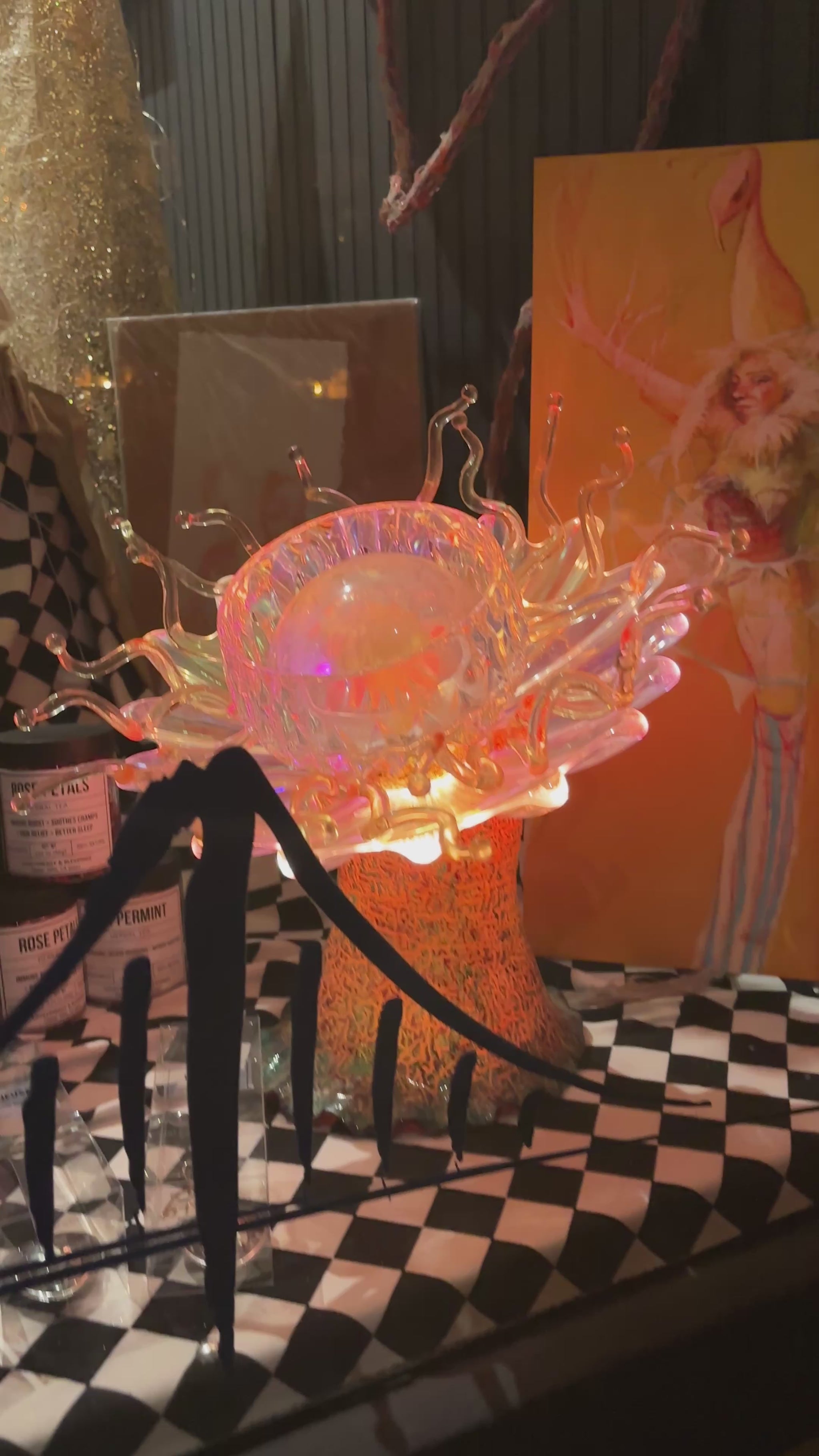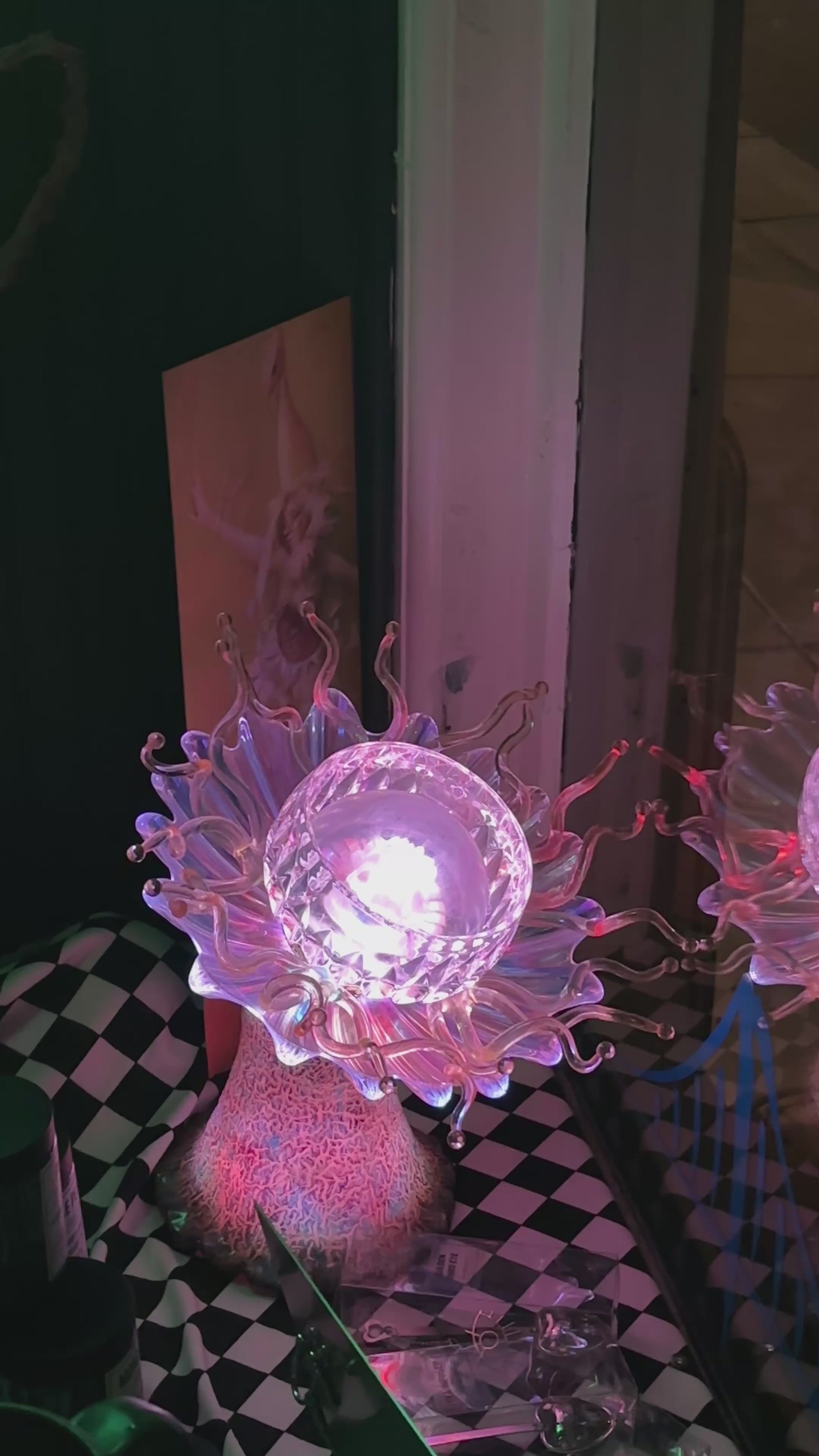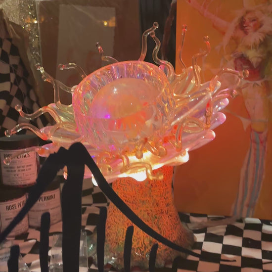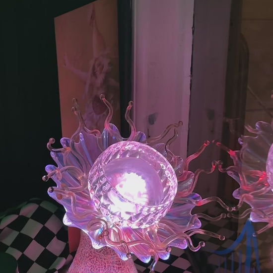 Elevate your collection with this captivating glass and poly botanical sculpture by Erick Dunn. Perfectly designed to mesmerize, it serves as a breathtaking centerpiece by day and transforms your space into an enchanting ambiance at night.