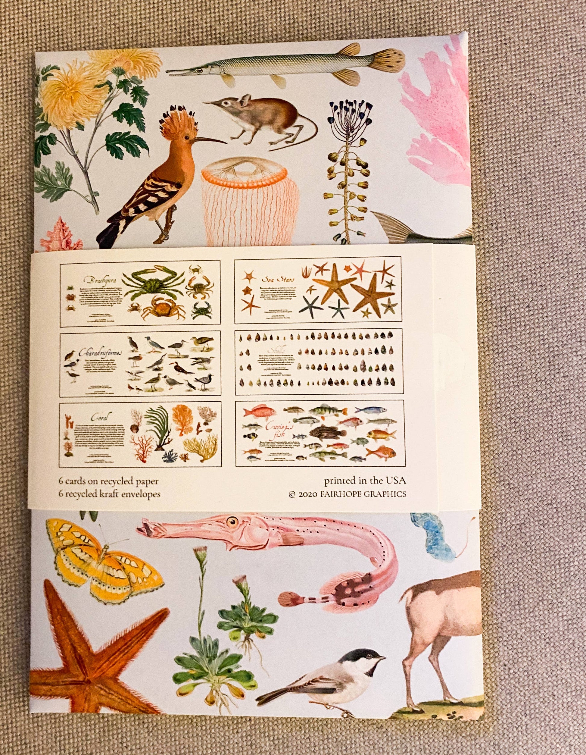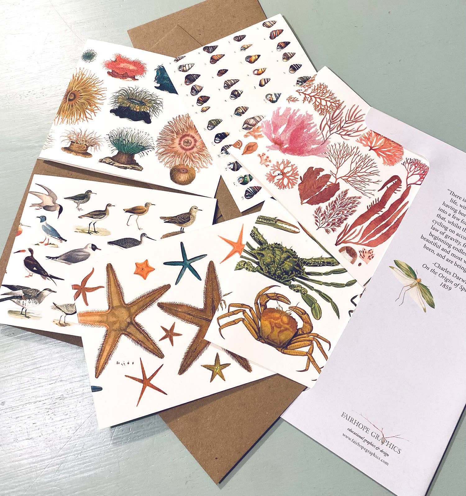 Variety of 6 cards featuring different shoreline animals and plants, in biodiversity folder with 6 kraft envelopes and descriptive strap. Includes crabs, sea stars, shorebirds, sea anemones, shells, and red algae.